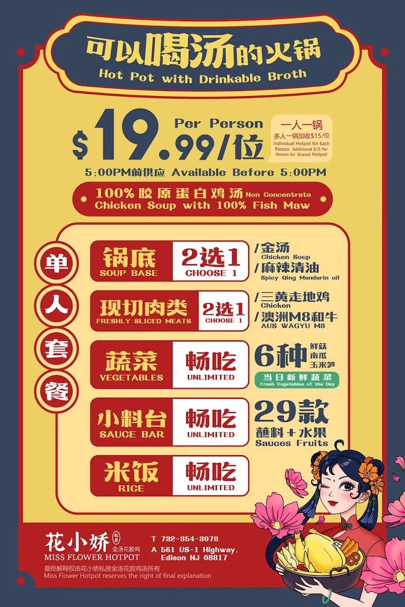 At Miss Flower Hotpot 花小娇金汤花胶鸡 Menu, diners can expect an indulgent hotpot experience that celebrates both comfort and creativity. Nestled at 561 U.S. Rte 1 in Edison, this spot brings the rich flavors of Chinese herbal cuisine to life, featuring its signature golden collagen chicken broth - silky, aromatic, and deeply satisfying. The menu offers a variety of premium ingredients ready to simmer, from tender chicken slices and handmade meatballs to fresh seafood and seasonal vegetables. Each bite feels balanced, letting the delicate broth shine without overwhelming the palate. Whether you prefer mild or spicy, the dipping sauces and condiments allow you to customize every flavor to your liking. It’s the kind of place where sharing a bubbling pot becomes a full-sensory experience - warm, communal, and deliciously memorable.